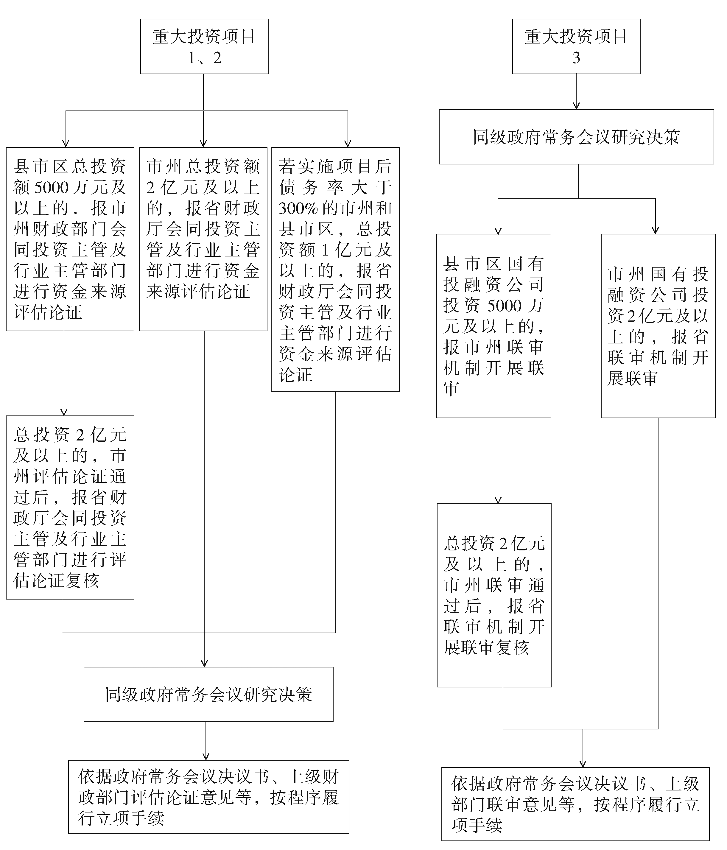 (三)符合第(一)条第1、2种情形的重大政府性投资项目,必须使用财政资金、政府债券资金,不得违规使用市场化融资新增政府隐性债务。在同级政府常务会议研究决策前,须由上级财政部门对资金来源进行评估论证。其中,县市区级总投资额5000万元及以上的,须报所在市州财政部门会同投资主管及行业主管部门进行资金来源评估论证;总投资额2亿元及以上的,在完成市州评估论证程序后,还须报省财政厅会同投资主管及行业主管部门进行评估论证复核。市州级总投资额2亿元及以上的,须报省财政厅会同投资主管及行业主管部门进行资金来源评估论证。若实施项目后债务率大于300%的市州和县市区,总投资额1亿元及以上的,须报省财政厅会同投资主管及行业主管部门进行资金来源评估论证。