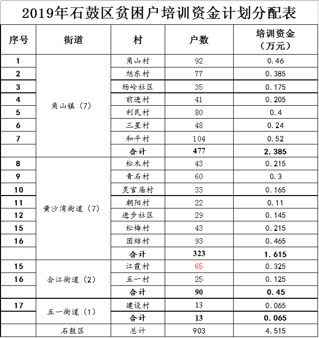 根据根据《365bet盘口_正规的365网站平台_365账号限制登录不了2019年度产业扶贫实施方案》中关于财政投入产业扶贫资金的表述,现汇总镇街上报2019年直接帮扶及农技培训的户数和人数,梳理出2019年共需拨付各镇街直接帮扶资金182.4万元,农技培训资金4.515万元,细项如附表。